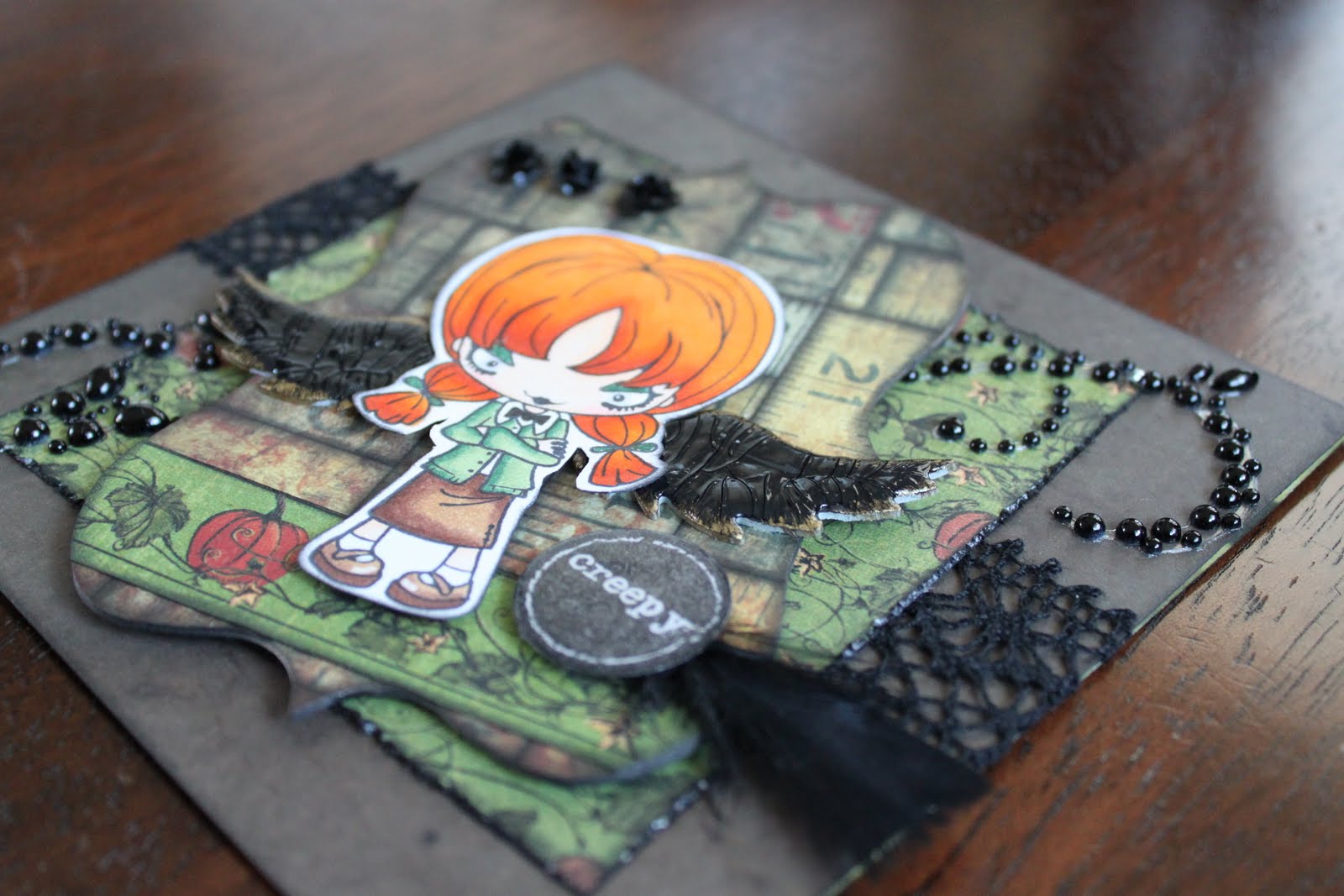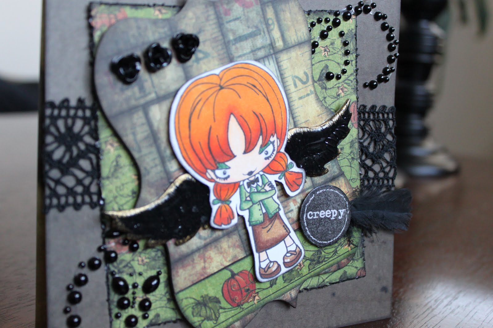 I had such a blast playing around with red hair with my Copic markers and I really like the way YR18, YR7 and YR4 blend. The Greeting Farm took a funky, yet refreshing turn with their Creepy Crew stamp collection. I LOVE them and had to get every day of the week... lol! This image is "Wednesday." She reminds me of a wicked cool school teacher. LOL! The paper collections I used are the Tim Holtz "Lost & Found" and Graphic 45's "Hallowe'en in Wonderland." I love the combination with the CC stamps. And those "At you Spica" glitter pens are AWESOME!! I used them on her eyelids and pig tail ties. I entered my picture in the Farm Fresh Friday challenge on the Greeting Farm website. And wow, what amazing work those ladies do on that blog!