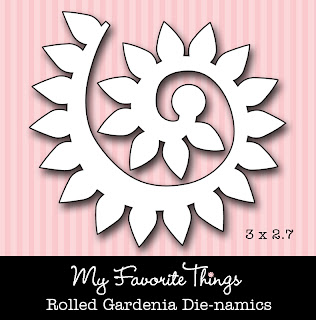 I created another double-layer Rolled Gardenia using the design paper and a black pearl and all the flowers from the Flower & Leaf Trio Die-namics are edged with Walnut Stain and adhered using a large black eyelet.